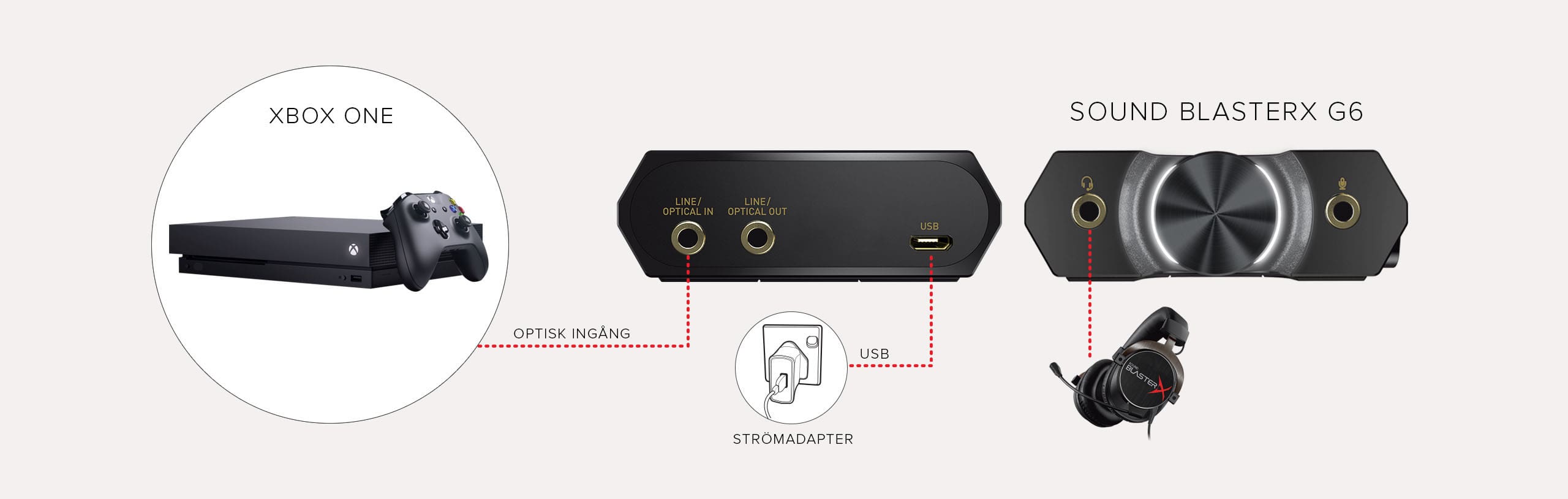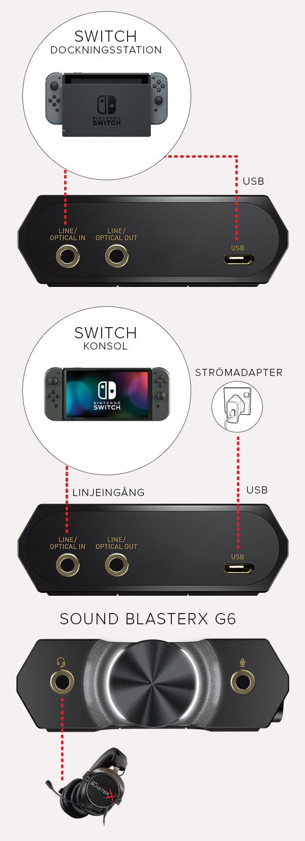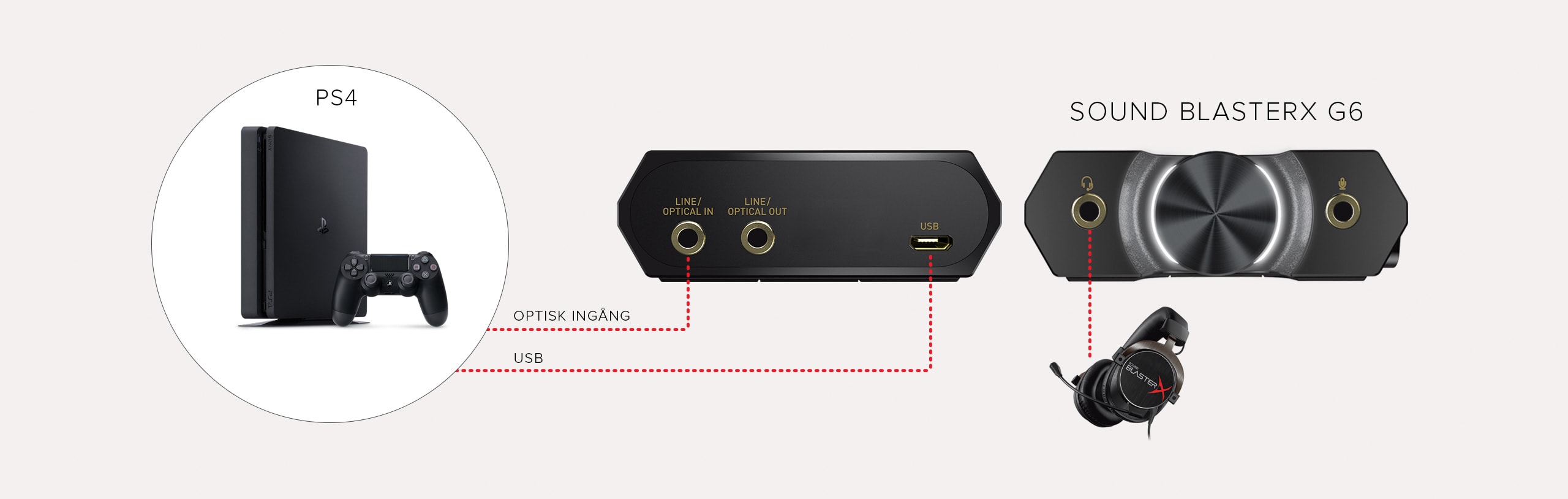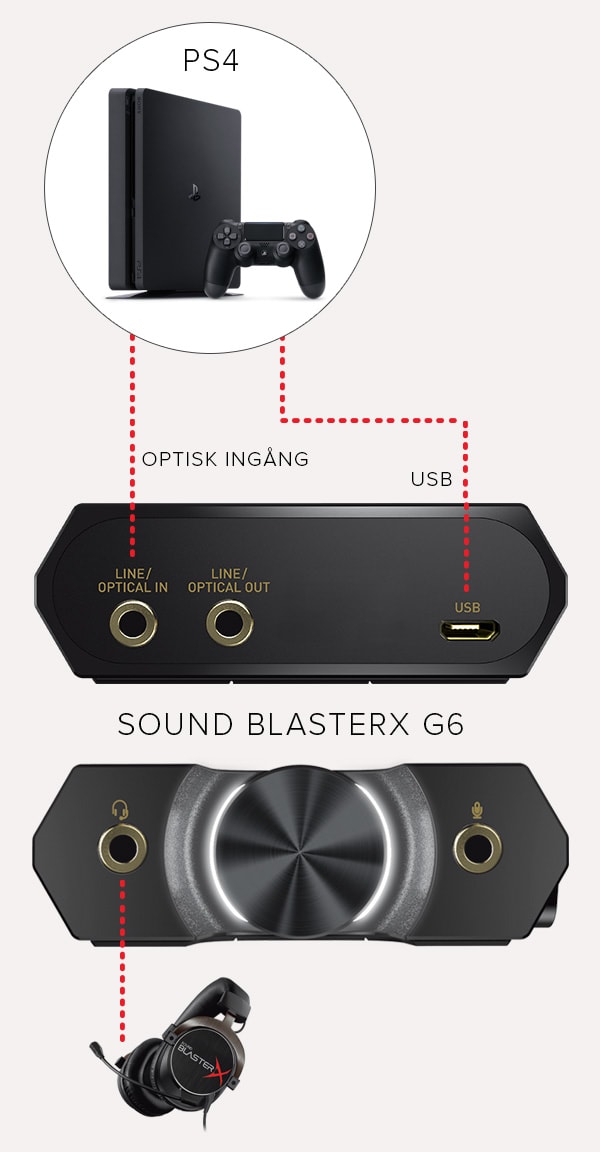 Sound BlasterX G6 kommer med flera uppkopplingsalternativ - optical, USB och till och med direkt inkoppling med kabel - vilket förbättrar din spelupplevelse omedelbart oavsett om du spelar på PC, PS4, Xbox eller till och med Nintendo Switch.