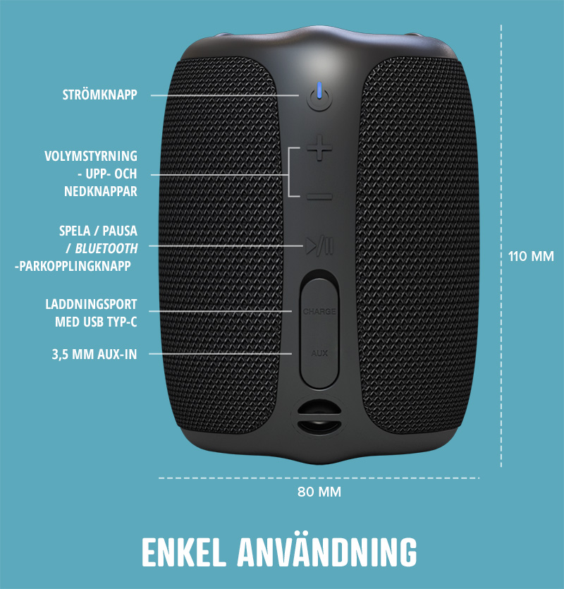 Creative MUVO Play är vår senaste portabla och IPX7-certifierat vattentäta Bluetooth- högtalare fullpackad med funktioner. Med dubbla mikroelement och dubbla baselement, spelar MUVO Play högre än den är! Utformad att användas i det fria, väger den lätt med sina 360g, så tas med lätthet med på poolfesten, när du campar eller nästa spännande äventyr!