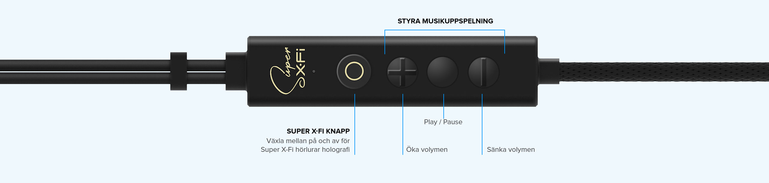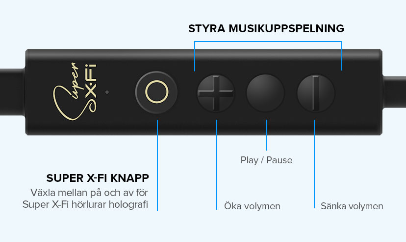 Du kan också slå av och på Super X-Fi audio holography, ändra volymen snabbt eller kontrollera din musiks playback. Alla dessa är fräcka kontroller som då når direkt på SXFI TRIO när du vill.